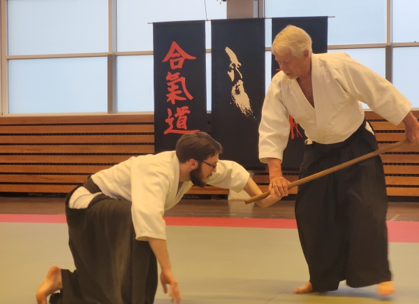 Alfred demonstrierte diese Prinzipien mit eleganter und konsequenter Führung. Ob der Angriff mit dem Stab, gegen den Stab oder waffenlos erfolgt, ist dabei nicht von Belang. Es war insbesondere (aber nicht nur) für Stab-Neulinge eine große Herausforderung, den Stab „wegzudenken“, hält man doch etwas in den Händen, was zum gelegentlichen „Festklammern“ verleitet. Gleichwohl konnten alle Teilnehmenden ihr individuelles Erfolgserlebnis mitnehmen. Die fröhliche Stimmung auf der Tatami wurde durch das schöne Frühjahrswetter und das einzigartige Schattenspiel der Bäume im Hintergrund an der großen Panorama-Fensterwand noch verstärkt. Die Atmosphäre war einfach schön.